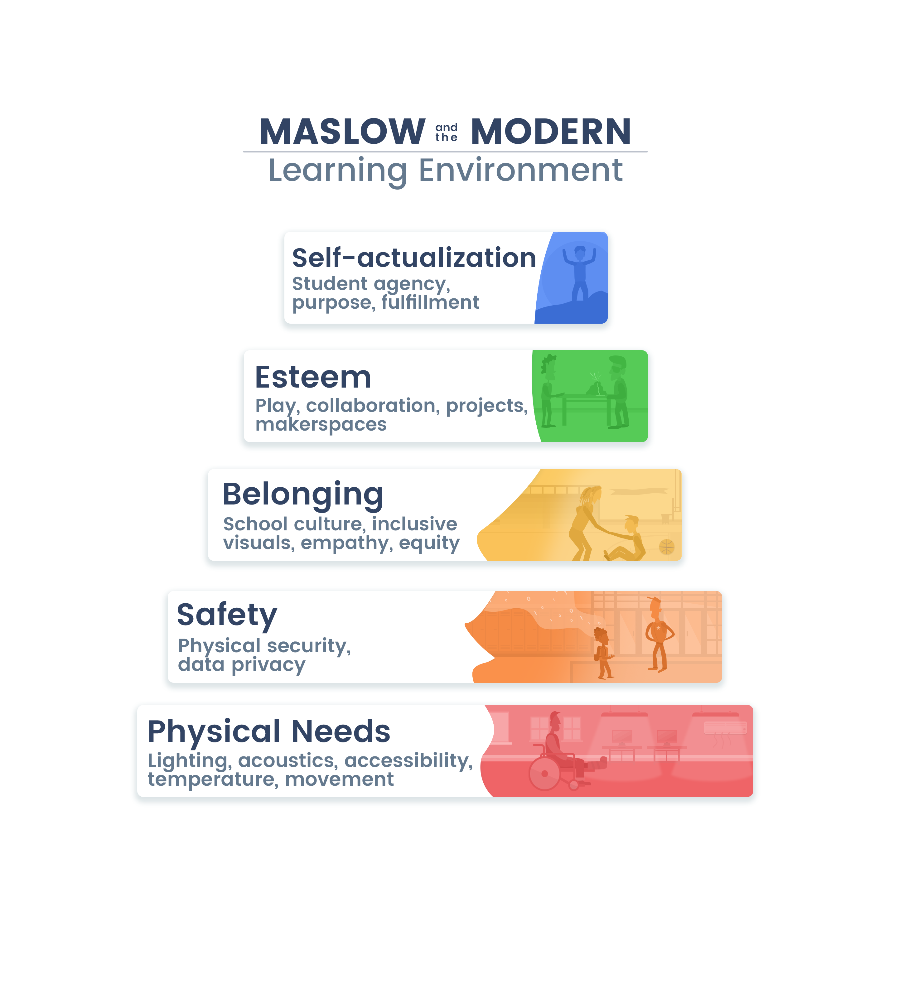 The most fundamental human needs linked to bodily comfort and function make up the wide base of the pyramid. In a school setting, we can equate this to creating an accessible, functional environment for all students. A group effort is required to achieve this in schools and districts—enlist the help of the school business office and maintenance teams to correct deficiencies where you find them.Sources of light in classrooms—whether natural, fluorescent, or some combination of alternative lighting—must be bright enough for students to complete their work. If possible, place SMART boards or other demonstration locations away from any glare from windows or lights.