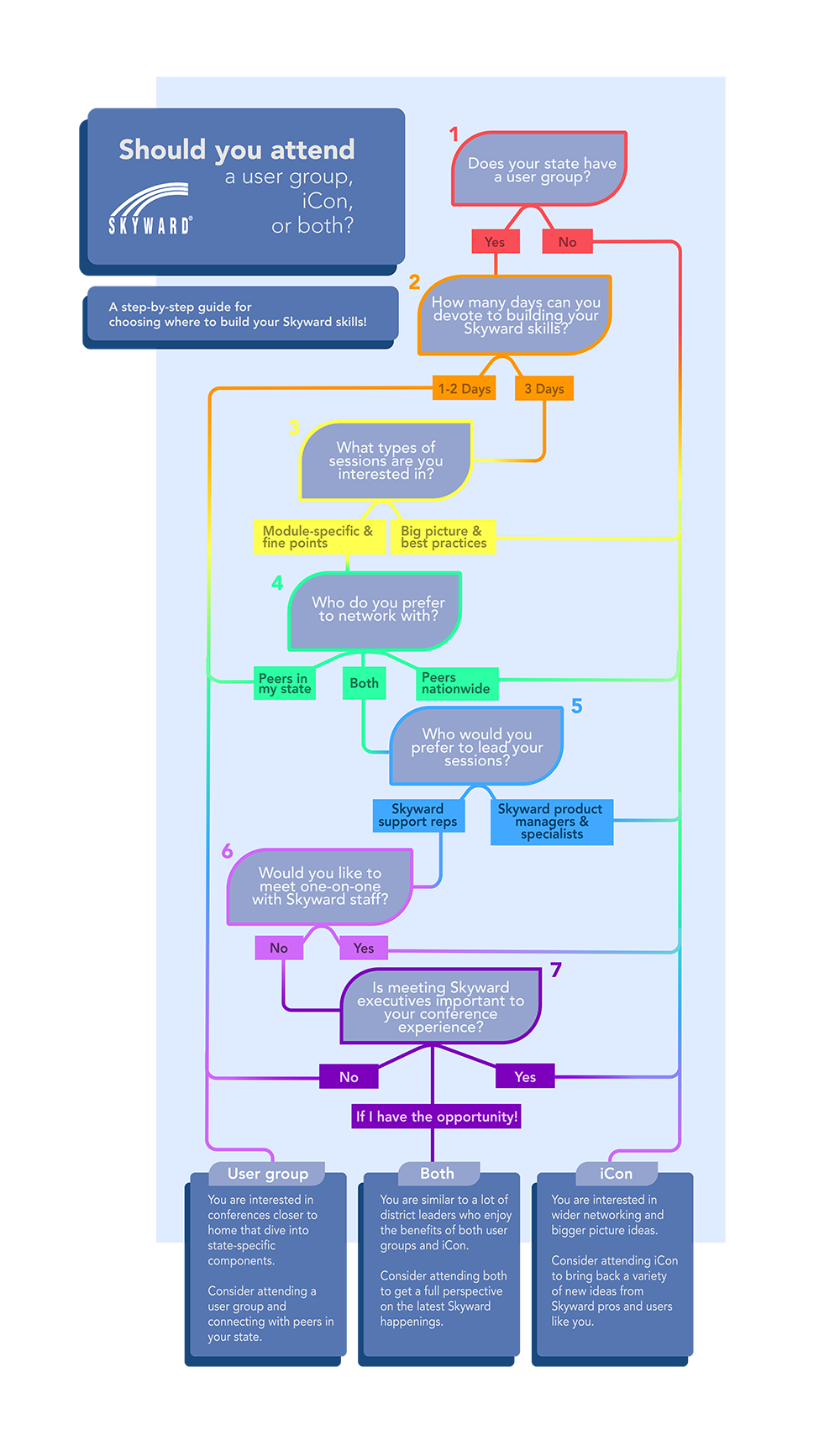 High-level sessions: If you’re looking to dive into granular details of the Skyward solution, user groups are the place to be. On the flip side, the session lineup at iCon offers higher-level instruction. Past sessions have included topics such as: